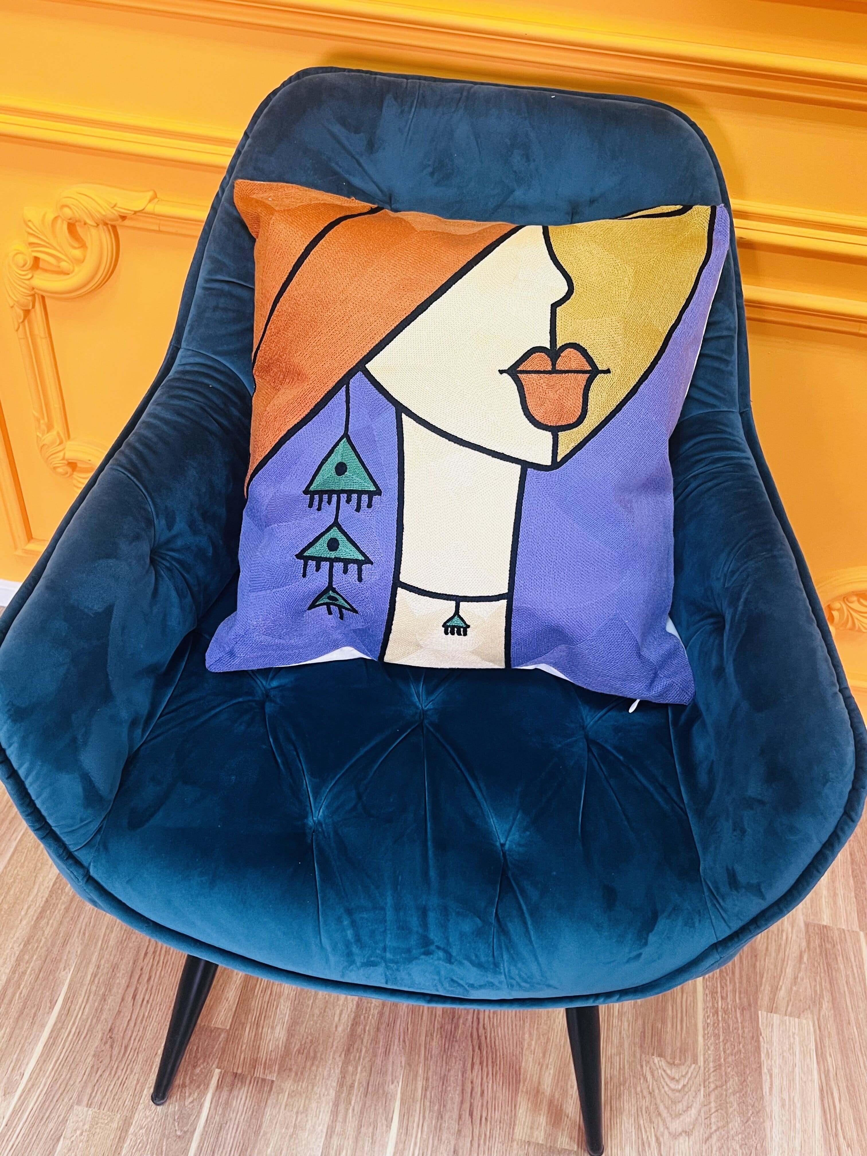 Лицевая сторона украшена объемным узором из вышивки, обратная сторона имеет однотонную поверхность. Наволочка имеет потайную молнию. Размер 45х45 см. (возможна погрешность 0,5-1 см.)